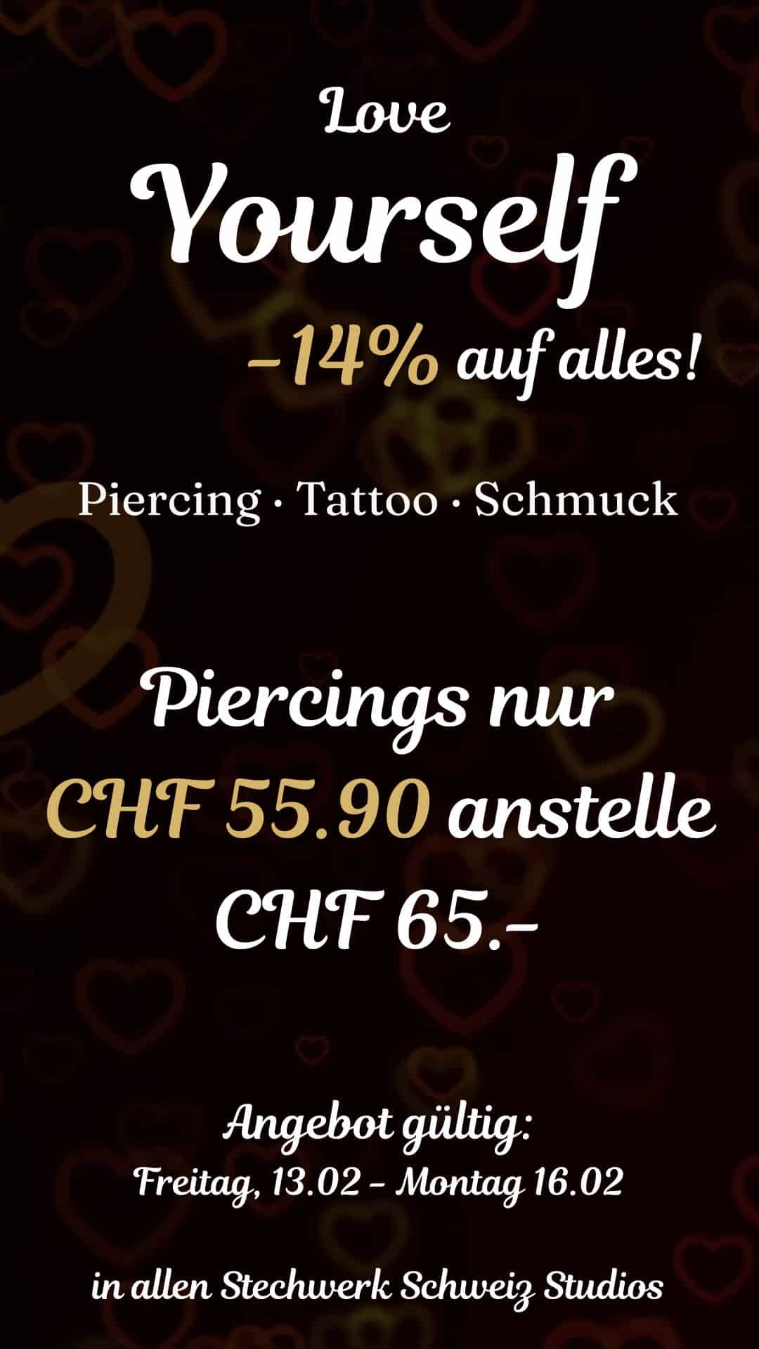 Wir stechen Piercings zum Preis von CHF 65.- inkl. Standard Schmuck! Lobe (Ohrlöcher) ab CHF 30.-, Intim, Surface, Industrial ab CHF 80.-