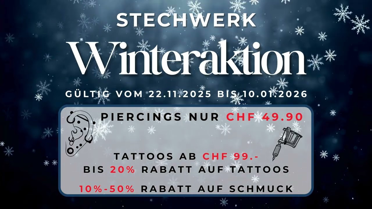 Venez nous rendre visite dès maintenant dans l’un de nos 6 magasins et profitez de nos offres. Que ce soit pour des piercings, des bijoux ou des tatouages. Nous vous offrons de fortes réductions sur tout. Si ce n’est pas maintenant, alors quand ? Valable jusqu’au 10.01.2026 !
